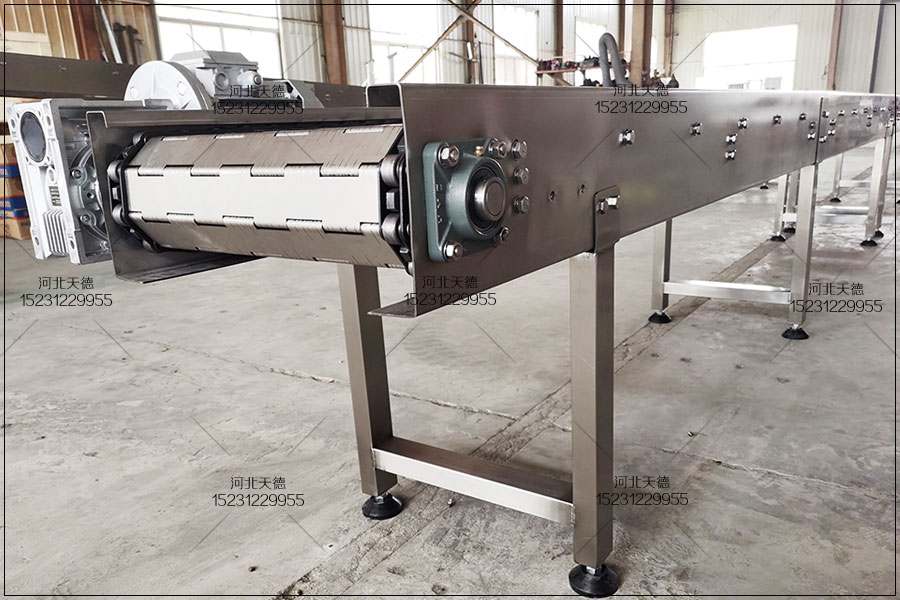 6、鏈板輸送機一般都可以直接用水沖洗或直接浸泡在水中,輸送機的每個部位清潔方便,能實現食品、飲料行業對衛生環境的要求;